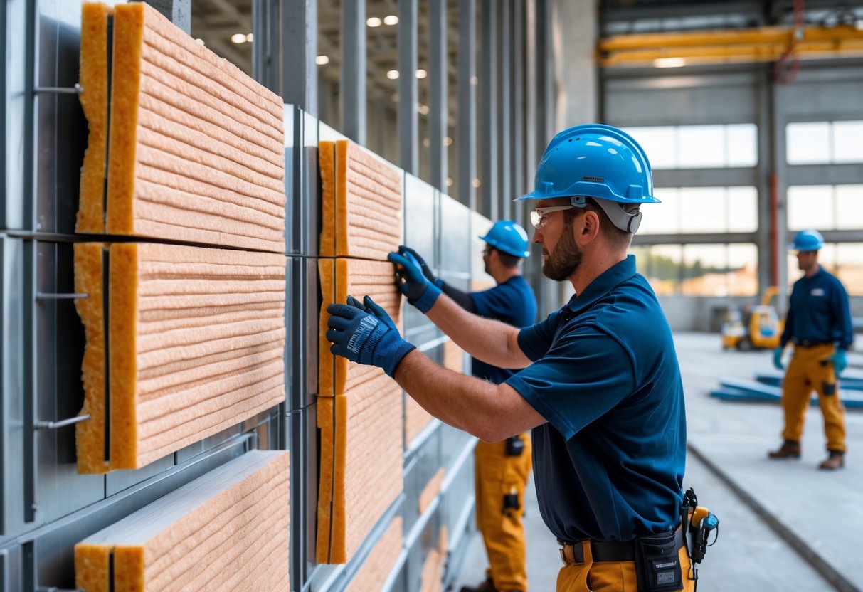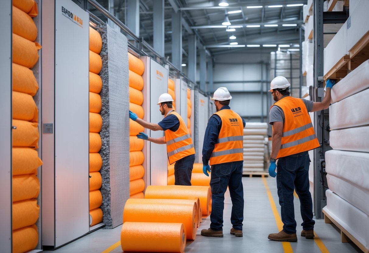 Workers in safety gear inspecting fire-resistant insulation materials in a modern industrial facility.