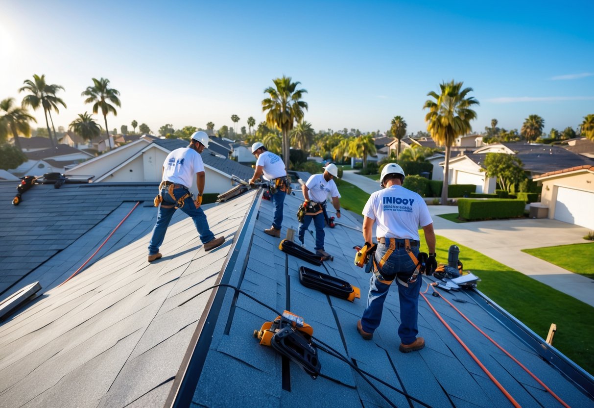 Roofers installing a roof on a house in a sunny suburban neighborhood with palm trees.