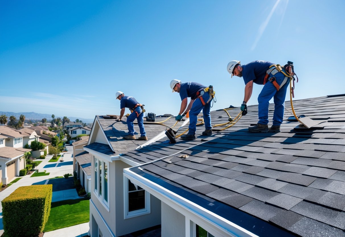Roofers installing a roof on a house in a sunny suburban neighborhood with palm trees.
